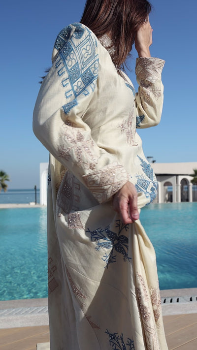 A timeless piece that marries tradition with elegance, the Azure Bloom Heritage Kaftan is crafted in a soft cream canvas adorned with intricate embroidery. Geometric motifs and delicate floral patterns in shades of blue and light brown flow across the garment, evoking both artistry and heritage. The high lace-trimmed neckline and puffed long sleeves add a regal touch, while the flowing silhouette embodies effortless grace. Perfect for serene seaside moments or refined gatherings, this kaftan celebrates cultural craftsmanship with modern sophistication.